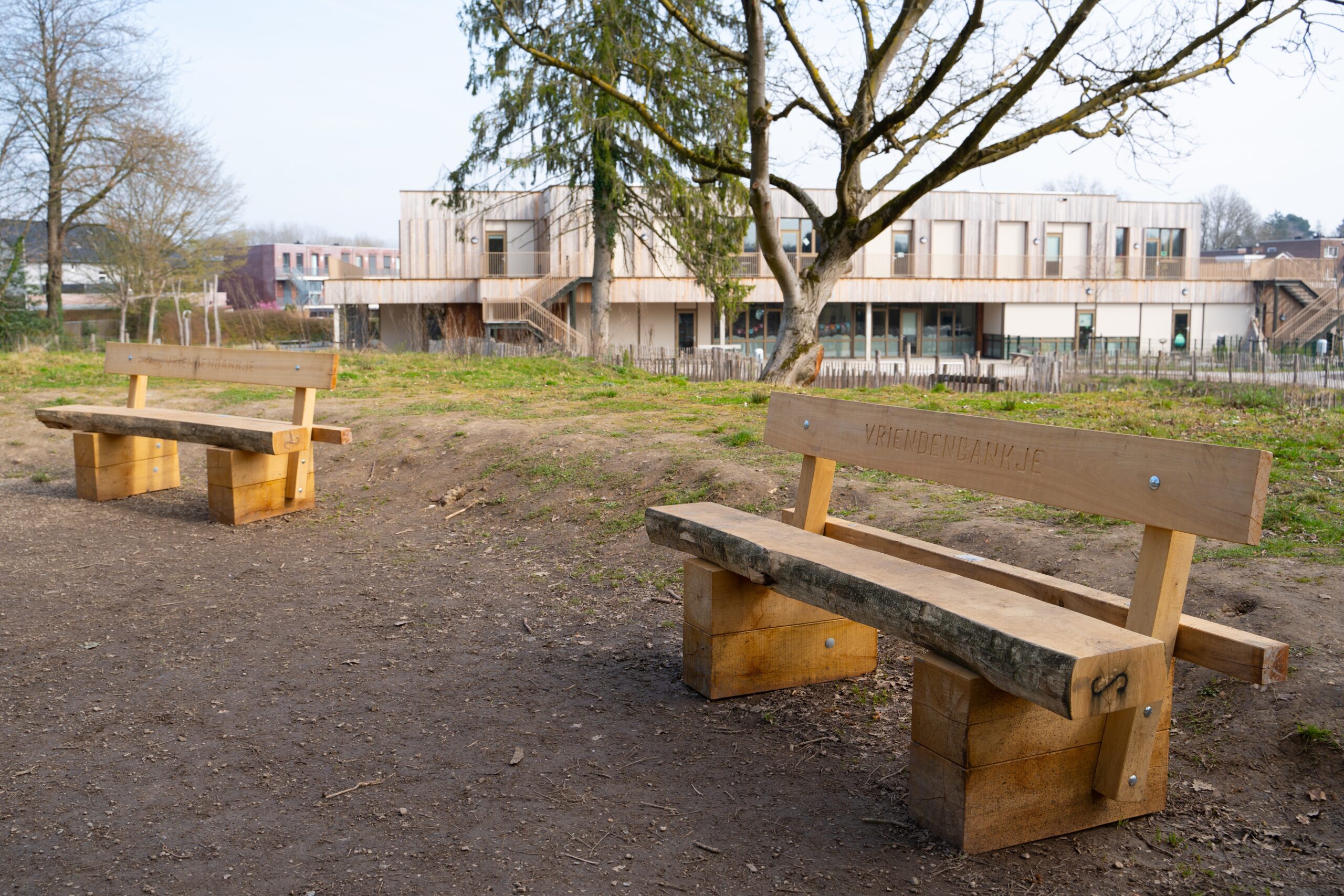 Naast de speeltoestellen, die onze ervaren timmermannen ook voor dit project weer volledig op maat maakten van Robinia hout, ontwierpen we voor deze school ook een tuinhuisje bekleed met Fraké, volledig in de stijl van het nieuwbouwpand van de school. Ook plaatsten we kastanje hekwerk als omheining, én maakten we Vriendschapsbanken van Italiaans Kastanje hout – uiteraard ook volledig op maat én met de hand.